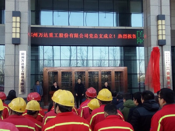 2018年1月10日上午10點(diǎn)整,中共鄭州萬達(dá)重工股份有限公司總支部委員會(huì)成立大會(huì)在鄭州萬達(dá)重工股份有限公司行政樓前隆重召開,鄭州航空港經(jīng)濟(jì)綜合實(shí)驗(yàn)區(qū)黨工委組織部程浩部長,銀河辦事處黨工委吳順祥書記、萬達(dá)重工董事長、書記何清、公司高管、全體黨員和員工代表參加了此次揭牌成立儀式。