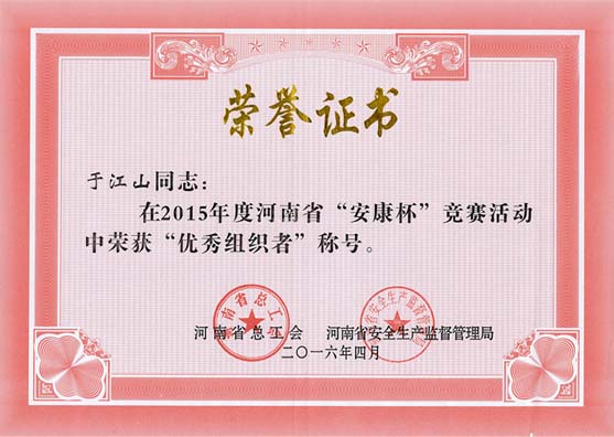 8月16日,河南省總工會與河南省安全生產監督管理局對2015年度“安康杯”競賽先進集體和個人進行通報表彰,鄭州萬達重工股份有限公司繼2014年度獲得河南省“安康杯”后,再次榮獲2015年度省級“安康杯”競賽先進單位稱號,股份公司工會主席于江山榮獲河南省“安康杯”競賽活動“優秀組織者”榮譽稱號。