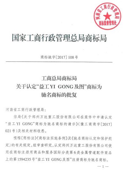 熱烈祝賀鄭州萬達重工股份有限公司“益工”商標被認定為中國馳名商標