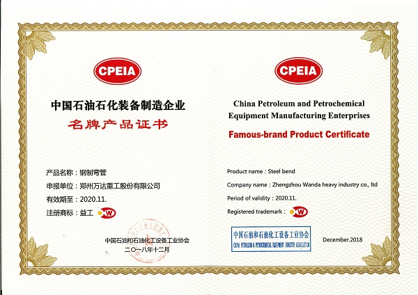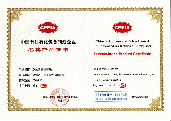 為了更好落實“中國制造2025”的發(fā)展戰(zhàn)略,培育企業(yè)具有科技創(chuàng)新水平的名牌產(chǎn)品,根據(jù)《中國石油石化裝備制造服務(wù)行業(yè)名牌產(chǎn)品評價推薦辦法》,按照中石協(xié)秘【2018】14號文的標(biāo)準(zhǔn)評價,萬達(dá)重工 “益工”品牌“雙金屬復(fù)合三通”和“鋼制彎管”兩種產(chǎn)品被中國石油和石油化工設(shè)備工業(yè)協(xié)會評定為“中國石油石化裝備制造企業(yè)名牌產(chǎn)品證書”。