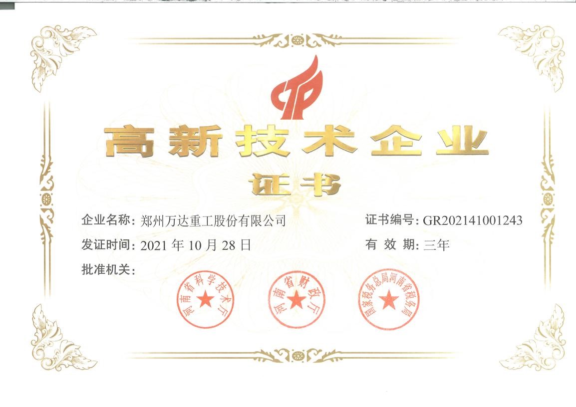 2021年12月8日,河南省科學技術廳、河南省財政廳、國家稅務總局河南省稅務局聯合下發了《關于認定河南省2021年度第一批高新技術企業的通知》(豫科【2021】175號)。通知顯示,根據《高新技術企業認定管理辦法》(國科發火〔2016〕32號)和《高新技術企業認定管理工作指引》(國科發火〔2016〕195號)有關規定,經企業申報、專家評審、認定報備、公示、備案等程序,經全國高新技術企業認定管理工作領導小組辦公室批復,河南省2021年度第一批共有2593家企業通過認定,鄭州萬達重工股份有限公司位列其中。