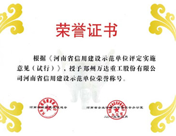 2016/01/28 489 熱烈祝賀鄭州萬達重工股份有限公司通過了河南省信用建設促進會和河南省企業信用評審委員會辦公室共同組織的河南省信用建設示范單位復審認證,被認定為河南省信用建設示范單位榮譽稱號!