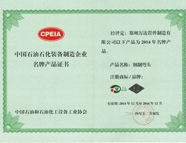 2016/01/28 496 公司益工牌鋼制彎頭被評為2014年中國石油石化裝備制造企業名牌產品。