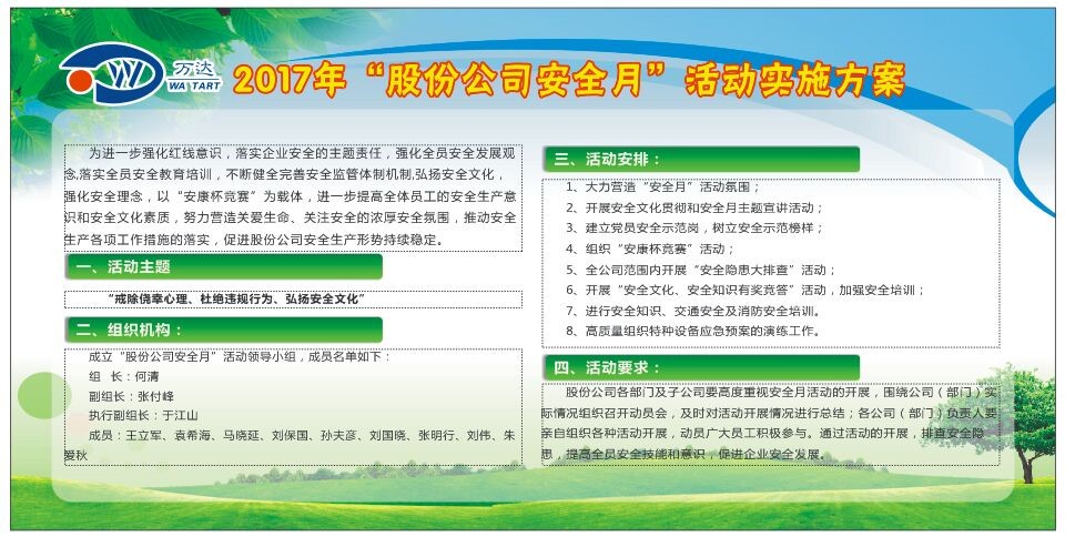 為進(jìn)一步加大安全生產(chǎn)宣傳力度,強(qiáng)化紅線意識(shí),推動(dòng)落實(shí)企業(yè)安全主題責(zé)任,弘揚(yáng)安全文化,強(qiáng)化安全理念,建設(shè)幸福萬達(dá)事業(yè),公司特于2017年7月1日—7月31日舉辦以“戒除僥幸心理、杜絕違規(guī)行為、弘揚(yáng)安全文化”為主題的安全月活動(dòng)。