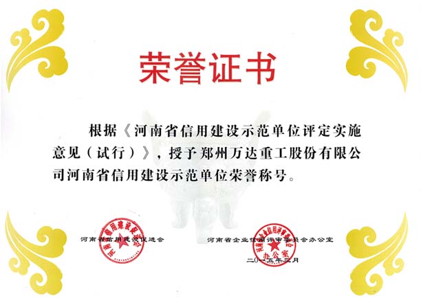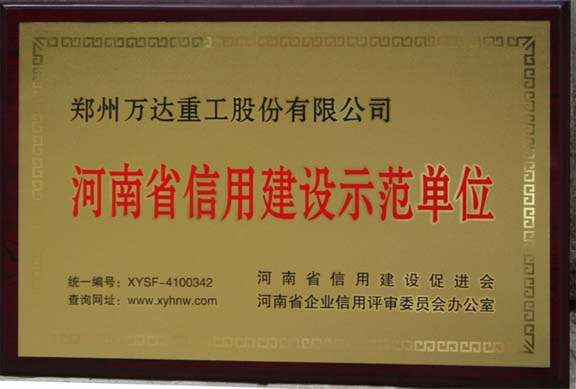 熱烈祝賀鄭州萬達重工股份有限公司通過了“河南省信用建設促進會”和“河南省企業信用評審委員會辦公室”共同組織的“河南省信用建設示范單位”復審認證,被認定為“河南省信用建設示范單位”榮譽稱號!