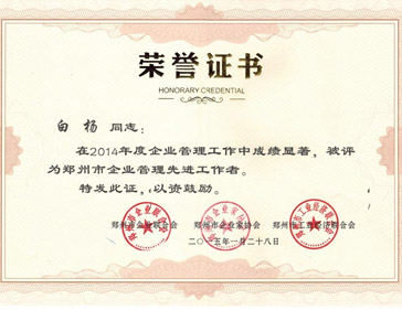 熱烈祝賀我公司白楊同志獲得鄭州市企業(yè)管理先進(jìn)工作者稱號(hào)