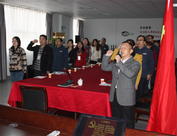2014年3月19日上午9:00公司支部全體黨員在會議室召開第一次黨員大會,整個會場莊嚴而肅穆。 大會分5個議程,在此會上,全體黨員面對黨旗和鮮艷的五星紅旗在支部書記何總的帶領下重溫入黨誓詞,全體黨員再次認真全文學習了黨章,并選舉產生了支部委員。